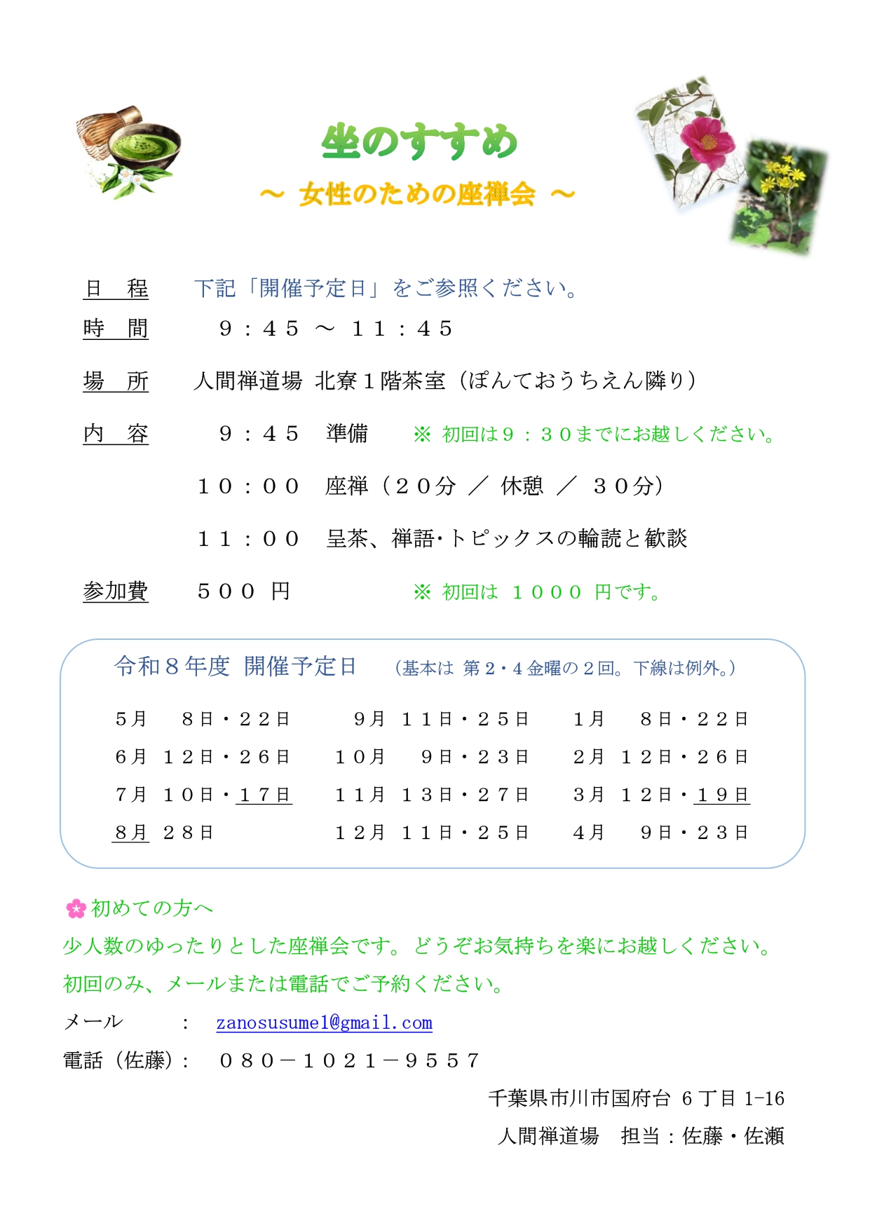 市川松戸座禅道場では各種の座禅会を開催しています。ご都合に合わせてご参加ください。