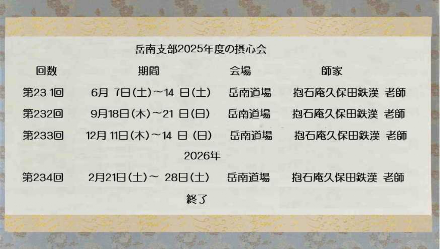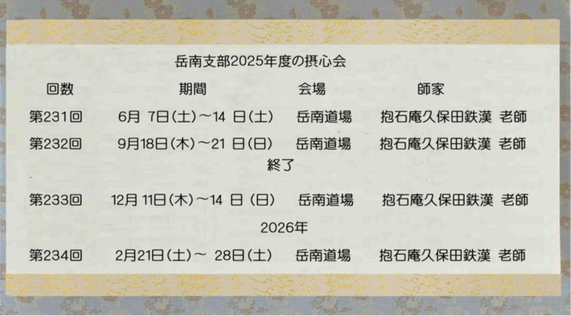 岳南支部では第229回摂心会を、抱石庵久保田鉄漢老師のご指導の下、2024年12月12日結制15日円了で厳修いたしました。提唱は十牛の図「(一)撥草尋牛」「(二)権為見跡」でした。
