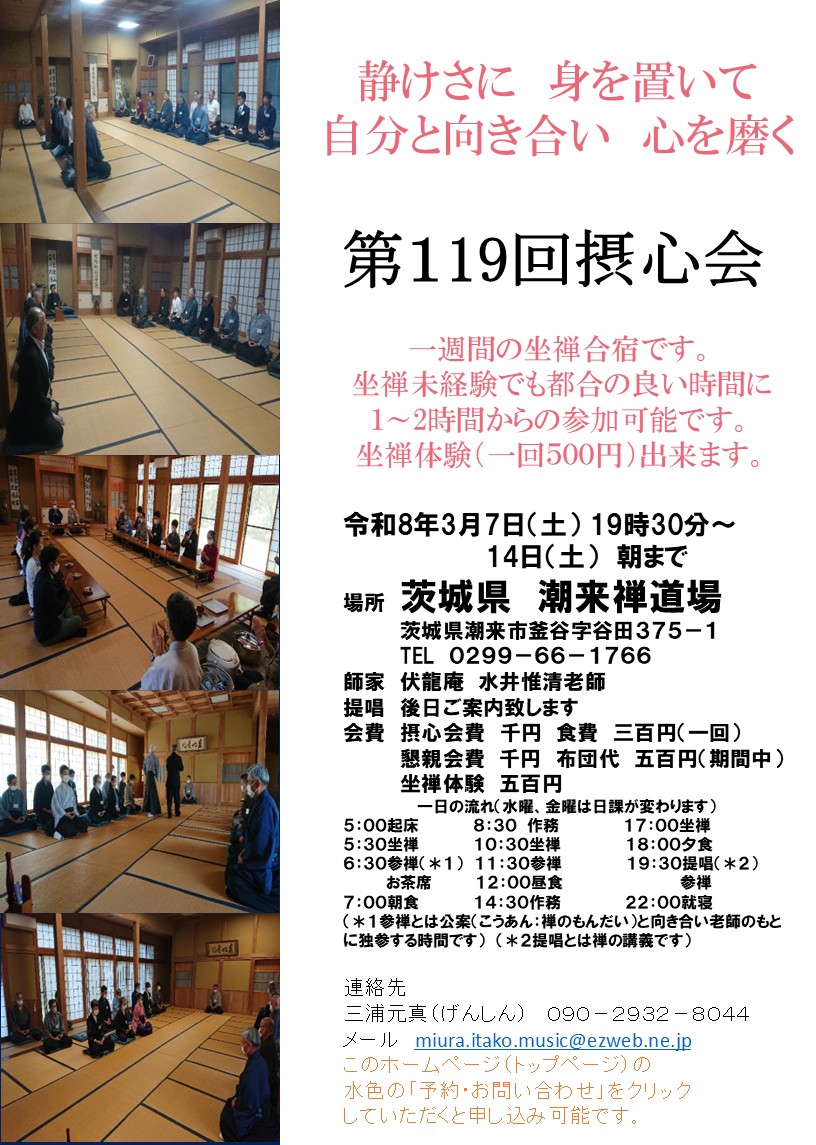 茨城県 潮来坐禅道場では年間3回の摂心会(せっしんえ:一週間の坐禅合宿)を開催しております。支部の柱となる行事です。ご都合の良い時間(1~2時間)の参加可能です。ご参考にご紹介いたします。
