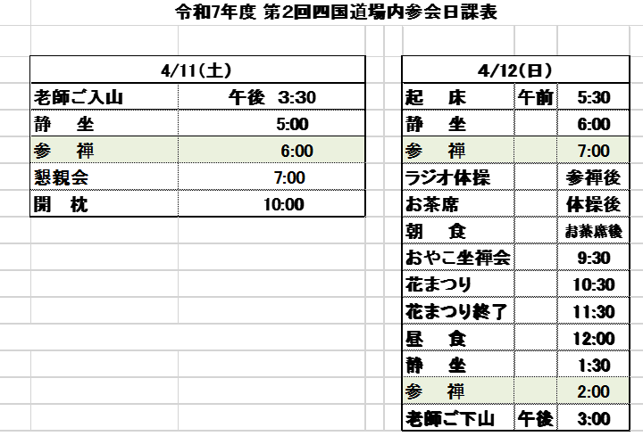 四国道場では4月の内参会を下記の日程で行います。内参は座禅修行の中でも本格的な、老師による個別指導(参禅)を含んだ道場に泊まり込んでの修行です。