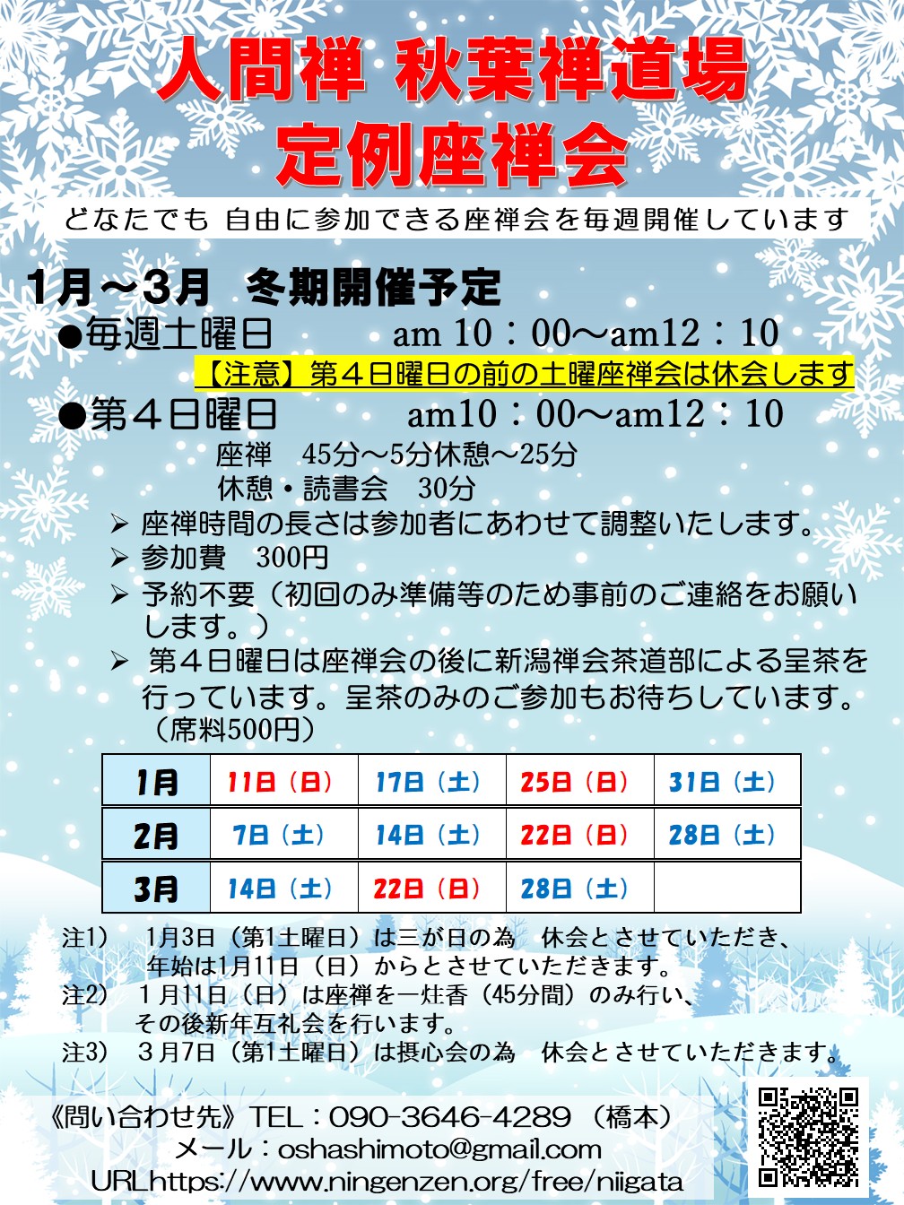 ・1~3月の座禅会は冬時間として、開始時間 10:00 ~ 終了時間 12:10 となります。