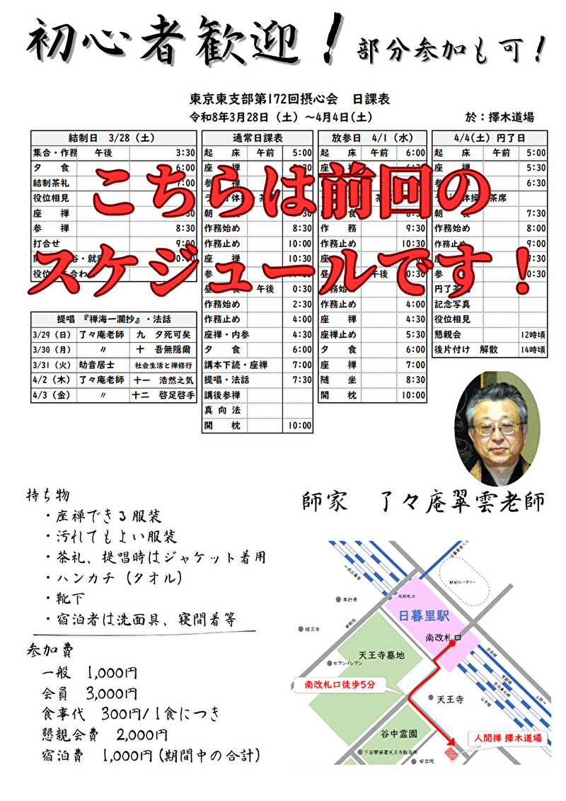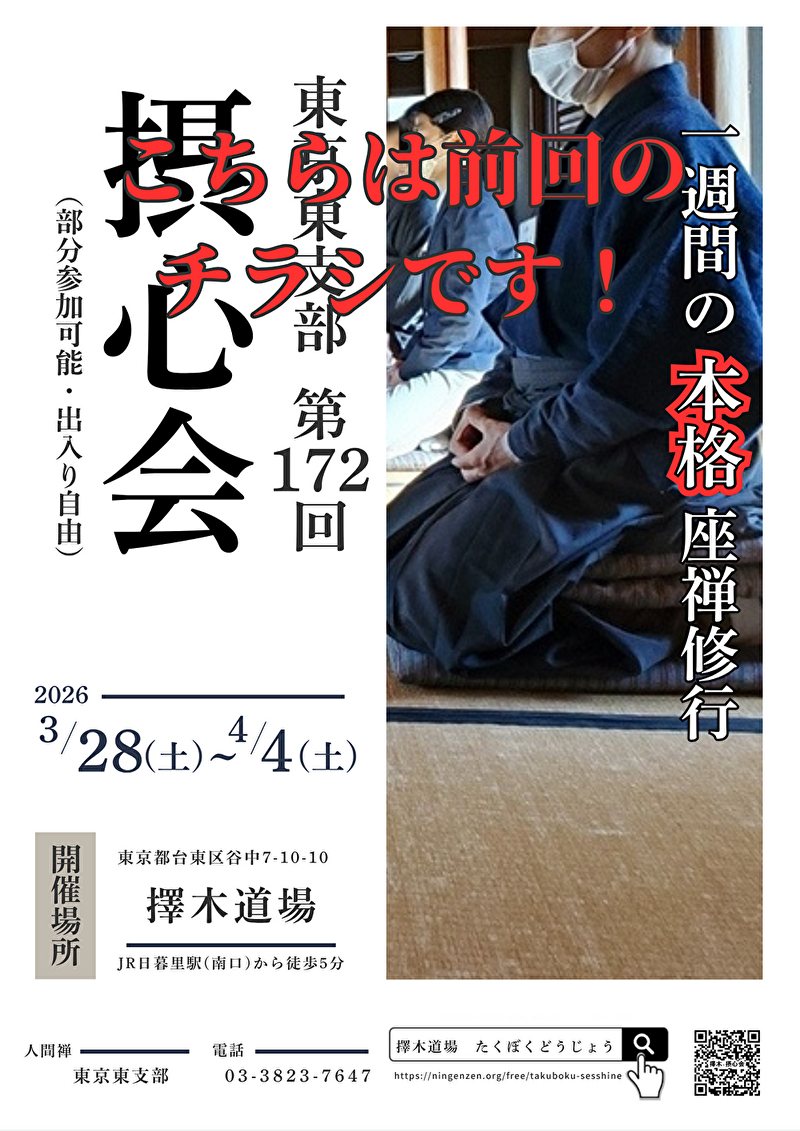 人間禅では3~7日間、年に数回開催する本格的な禅修行の期間を「摂心会(せっしんえ)」と呼びます。