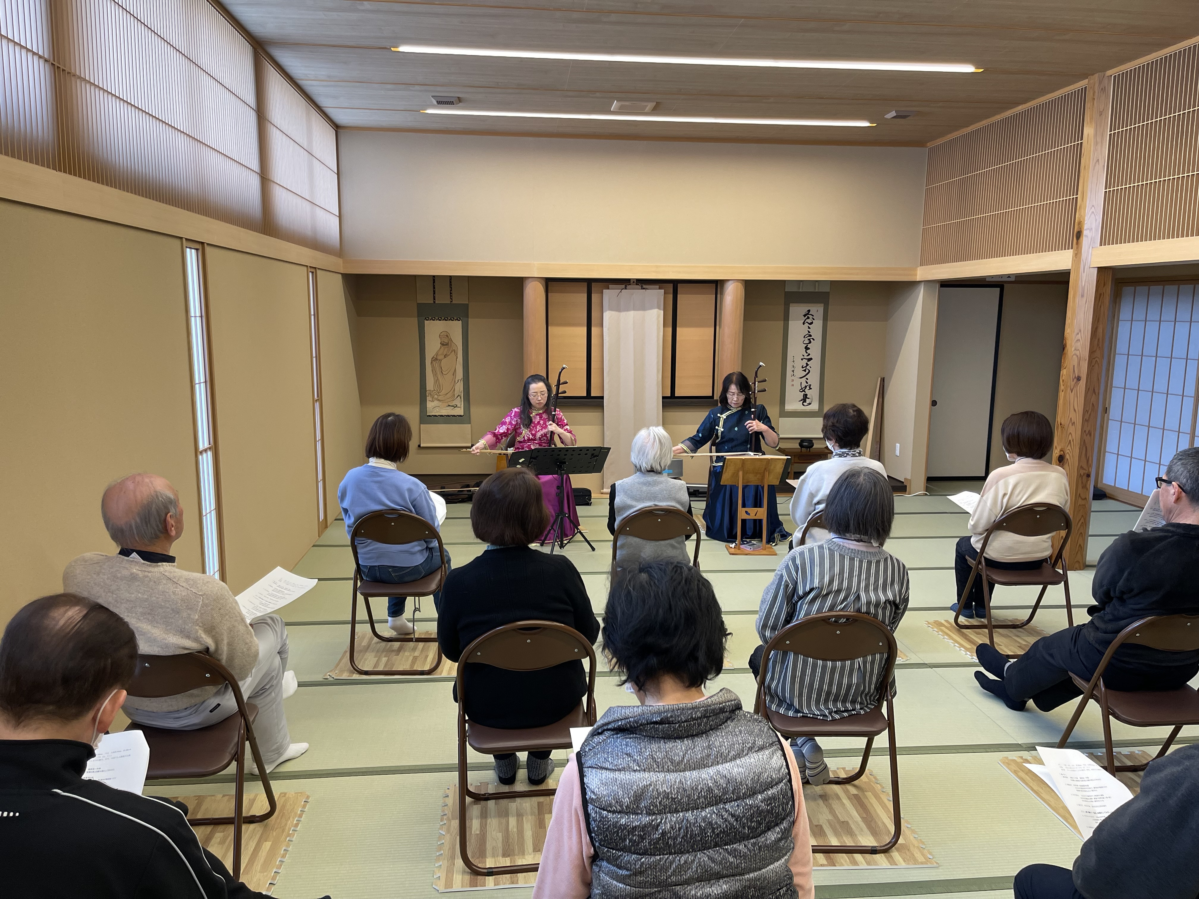 16人お集まり頂き、二胡の演奏を聴いて、参加者1人1人が実際に二胡に触り音出しの体験をしました。