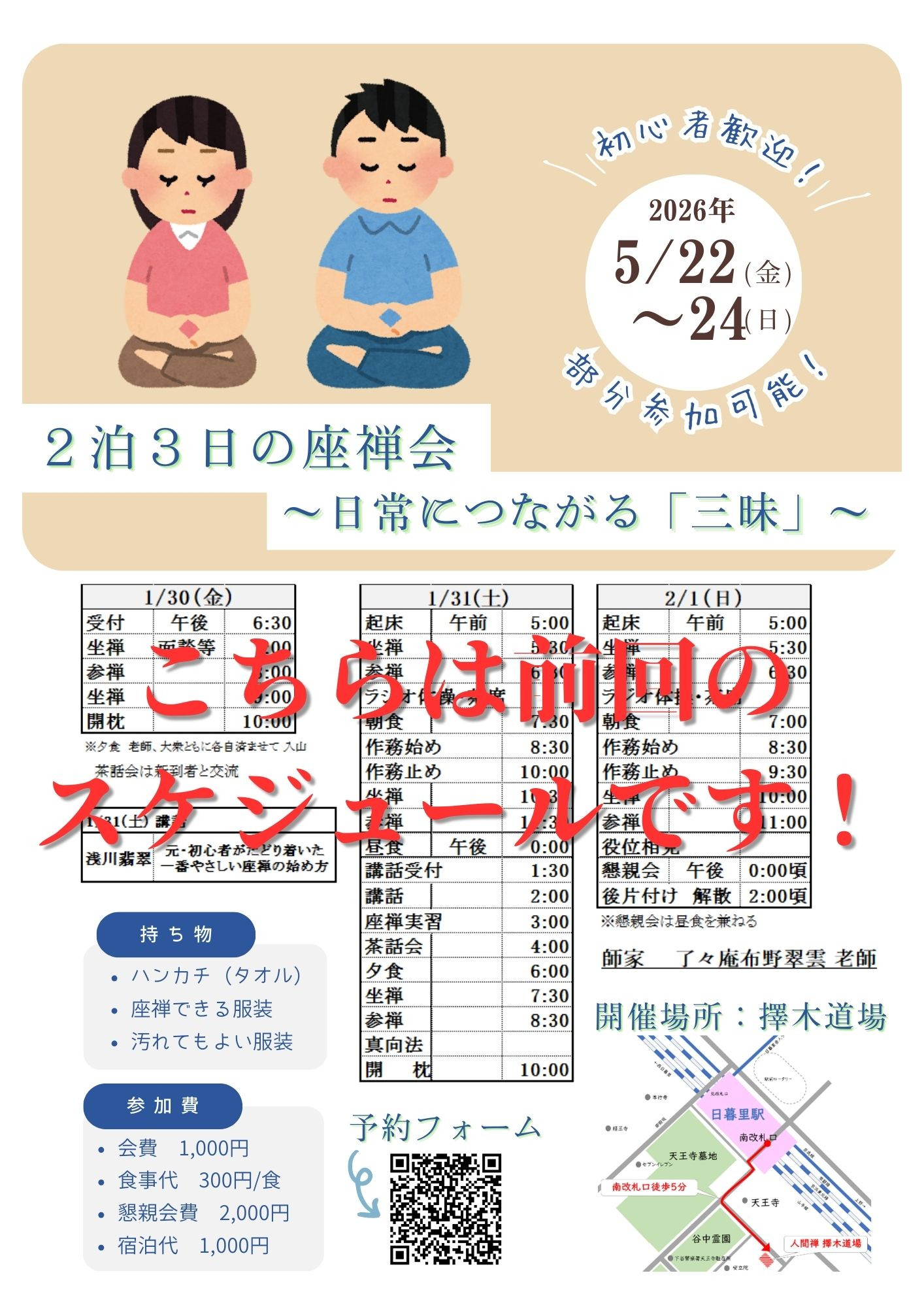 ・初めての方は作法や座り方をお伝えしますので、開始の30分前にはお越しください。