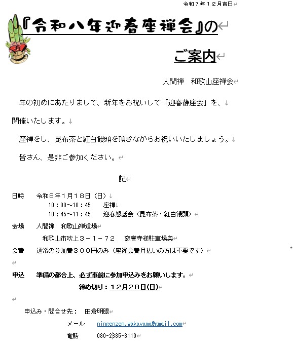 ② 1月18日は迎春座禅会です(10時開始)
